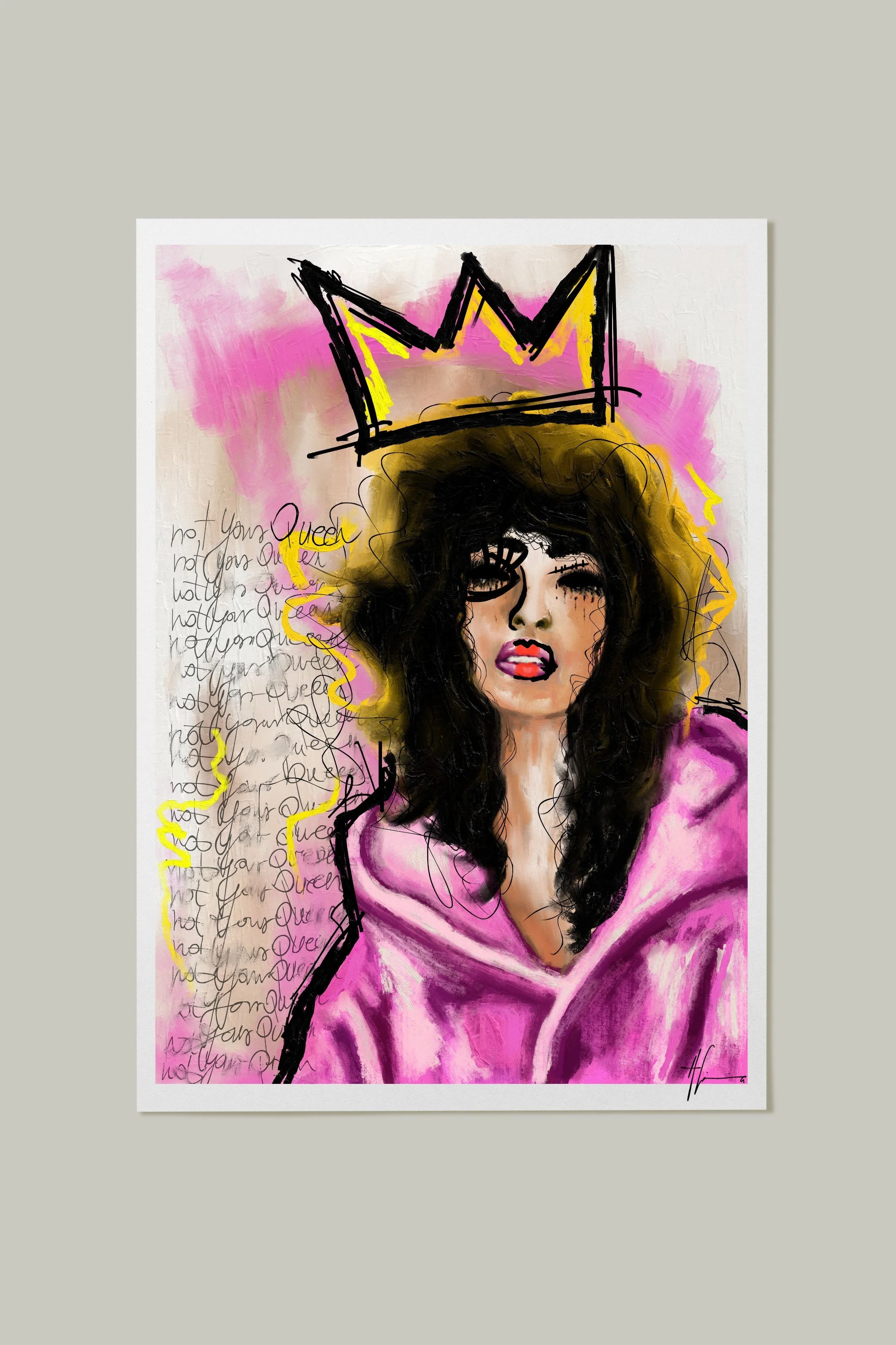 This contemporary figurative portrait centers on inner authority and emotional intensity. The symbolic crown is not about status, but self-definition — a visual marker of autonomy and presence. The direct gaze and expressive color fields create tension between vulnerability and control.